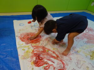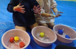 アルバム お知らせ アルバム お知らせ ダイナミックに氷遊び! 2025年10月14日 冷たい氷で感触遊びを楽しみました。 氷を手にすると 「きゃ~!冷た~い!」 「気持ちが良いね!」 と大はしゃぎの子ども達! 手や足にも色が付いたことに気が付くと、さらに意欲に火が付き… ダイナミックにおえかきがスタート! まっすぐな線やくるくるした線、色々な種類の線を描いたり、 線を重ねて描いて混色を楽しんだり… 夢中になって遊ぶ姿が見られました。