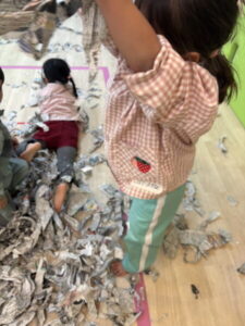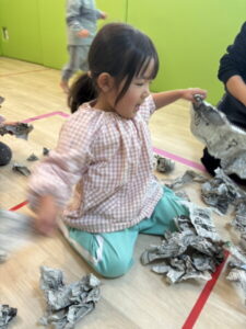 びりびり、くしゃくしゃ、音や感触を楽しみながら、みんな夢中です。