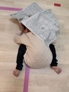 おおかみに捕まらないようにドキドキしながら新聞紙にかくれます。